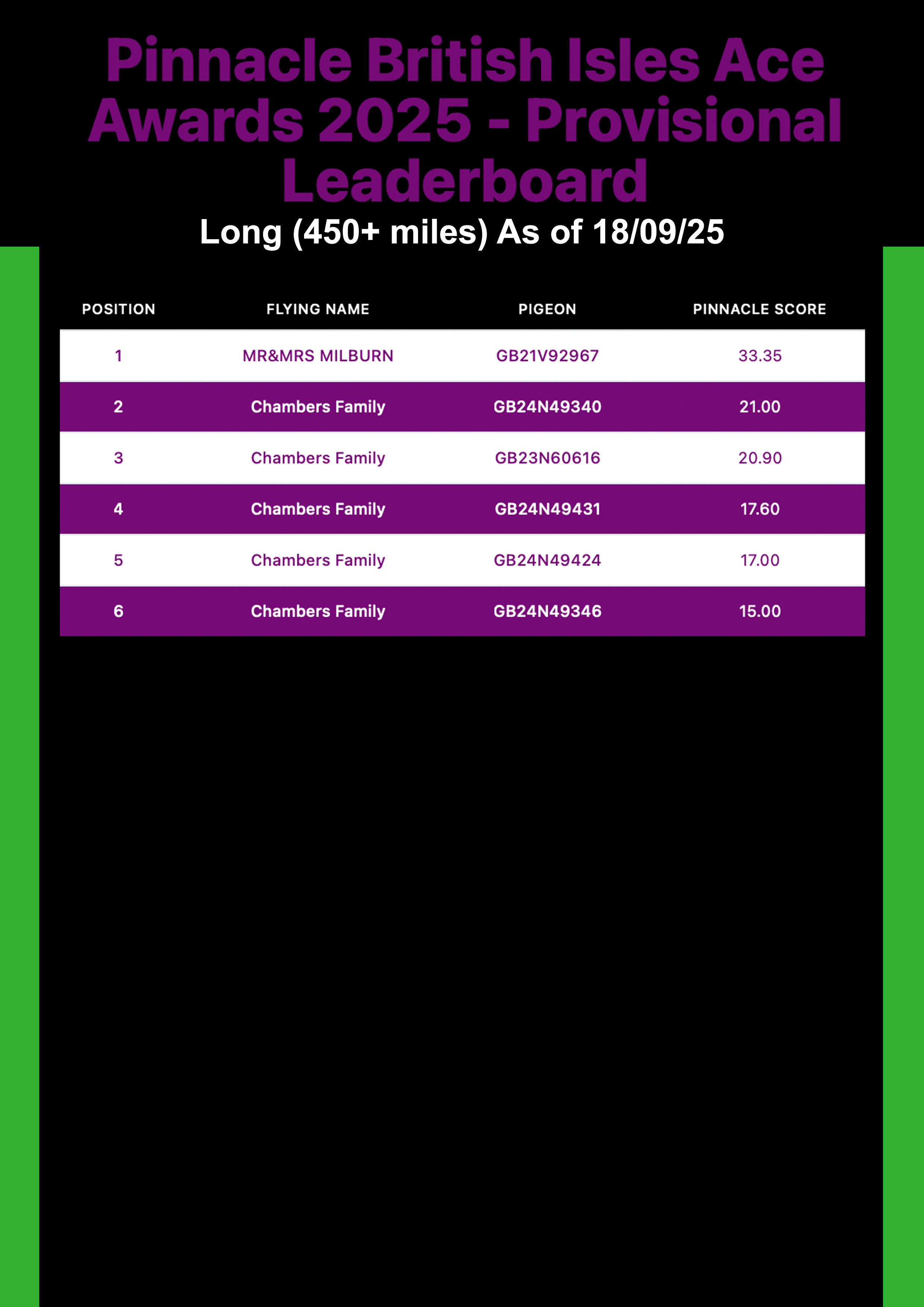 For British Isles Ace Pinnacle ‘Long’ (450+ Miles) Old Bird - Maximum of 2 Best Individual Performances submitted